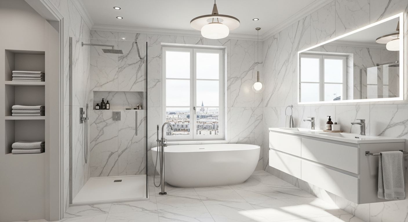 - Choix des Matériaux et Finitions : Nous offrons une palette variée pour s'adapter à chaque budget et style. Pour le haut de gamme, nous proposons marbre, travertin, Corian, robinetterie de designer (Grohe, Hansgrohe), meubles sur mesure en bois précieux, receveurs de douche en pierre ou résine. Le milieu de gamme inclut le grès cérame grand format, la faïence de qualité, des meubles de marques reconnues et une robinetterie équilibrée. Pour une option économique, nous optimisons avec du carrelage standard, des revêtements PVC ou de la peinture hydrofuge, et des meubles préfabriqués fonctionnels. Chaque choix est fait pour garantir durabilité et esthétisme.